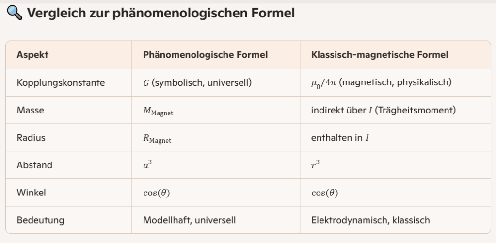 „Die kontaktlose Rotation des freien Magneten entsteht durch ein asymmetrisches magnetisches Drehmoment, das ihn in eine anziehende Orientierung kippen möchte. Da sein Eigengewicht eine vertikale Neigung verhindert, entlädt sich das Moment in eine horizontale Rotation. Die magnetische Formel beschreibt die Ursache der Drehbewegung, die gravitative Formel deren kanalisierten Verlauf. Beide sind notwendig, um das Prinzip der feldinduzierten, kontaktlosen Eigenrotation unter mechanischer Einschränkung vollständig zu erfassen.“