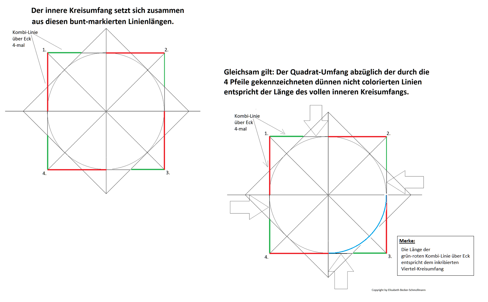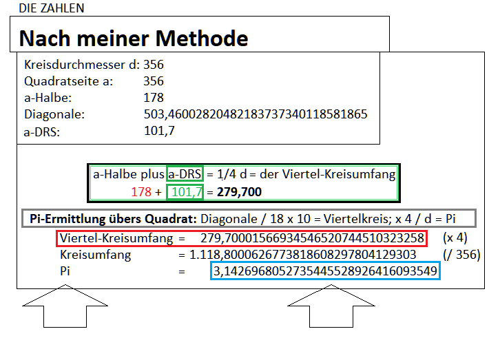 Pi-Halbe=Produkt der Zahlen÷(Verha¨ltnisse der Quadrate und Kreisabschnitte)\text{Pi-Halbe} = \text{Produkt der Zahlen} \div (\text{Verhältnisse der Quadrate und Kreisabschnitte})